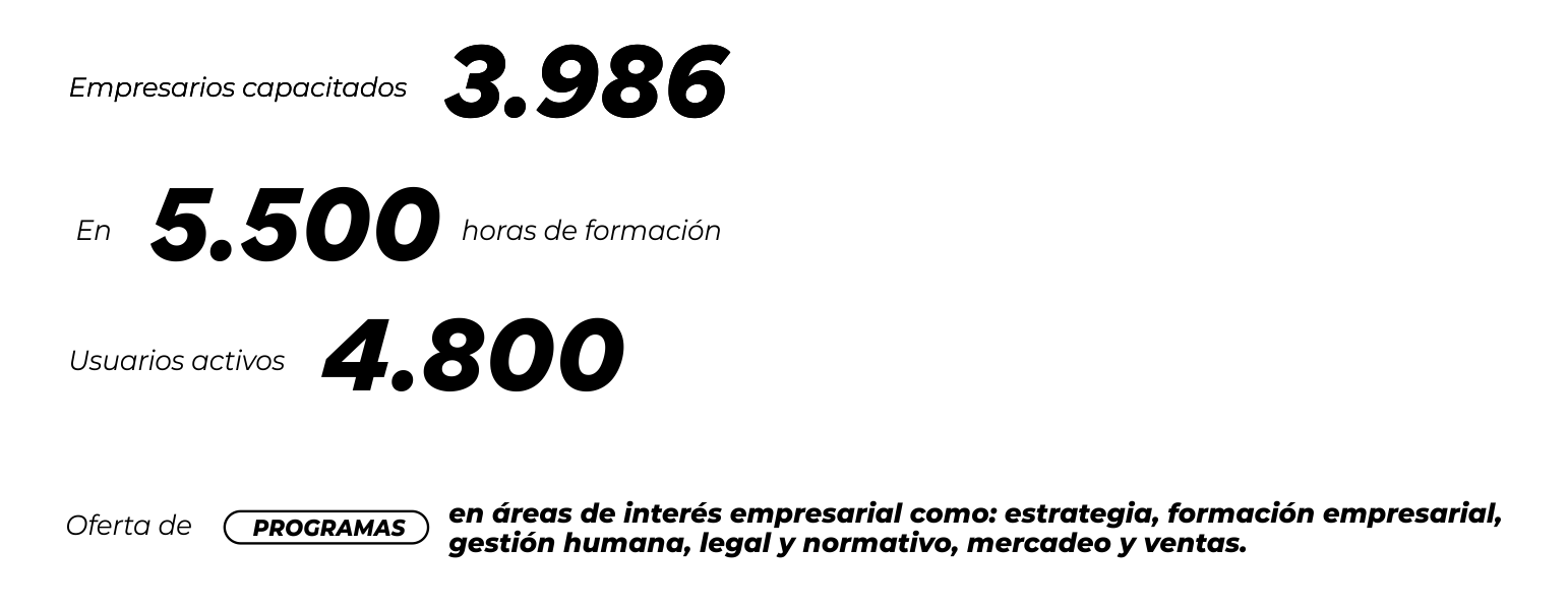 en áreas de interés empresarial como: estrategia, formación empresarial, gestión humana, legal y normativo, mercadeo y ventas.